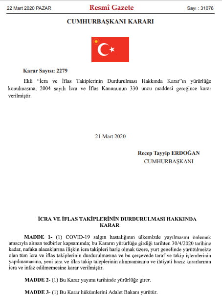 22 Mart 2020 tarihli Resmi Gazete’de yayımlanan ekli Cumhurbaşkanlığı kararnamesiyle İİK md. 330 uyarınca icra takipleri 30 Nisan 2020’ye kadar durdurulmuştur. Bu tarihe kadar yeni takip de açılmayacaktır. İlgili Yazılar