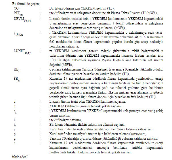 “(2) YEKDEM geliri aşağıda yer alan formüle göre hesaplanır: